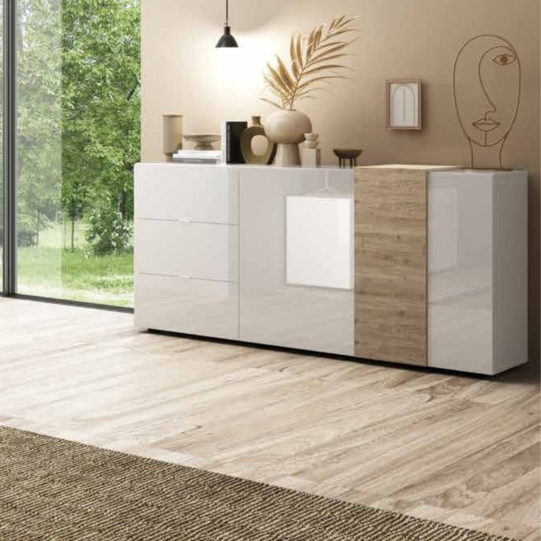 Madia contenitore 2 ante e 3 cassetti Bianco lucido e rovere Cadiz – Viktra