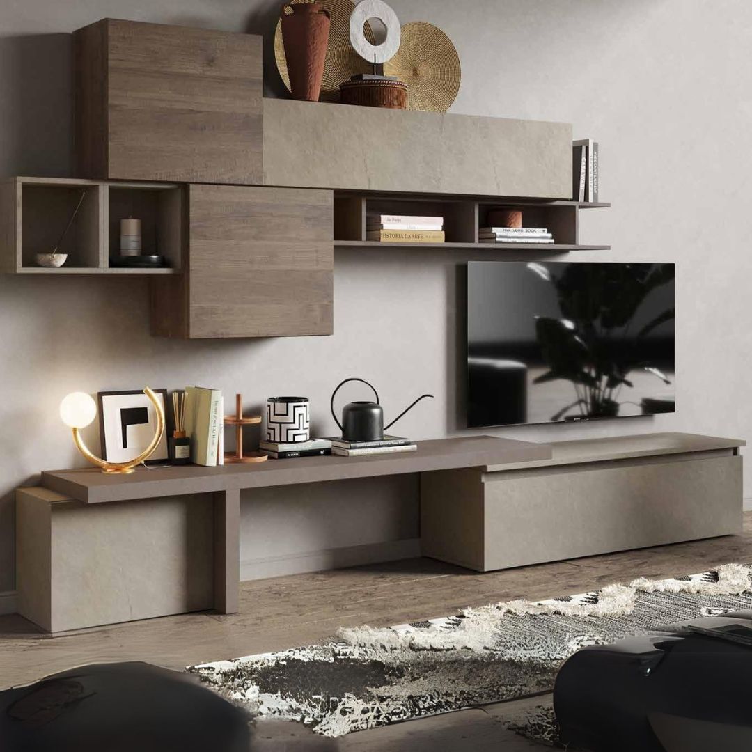 Questa parete attrezzata si distingue per la sua eleganza sobria e design minimalista, con una finitura in Argilla, Bronzo e Mercure, che conferisce una nota distintiva e contemporanea all’ambiente.