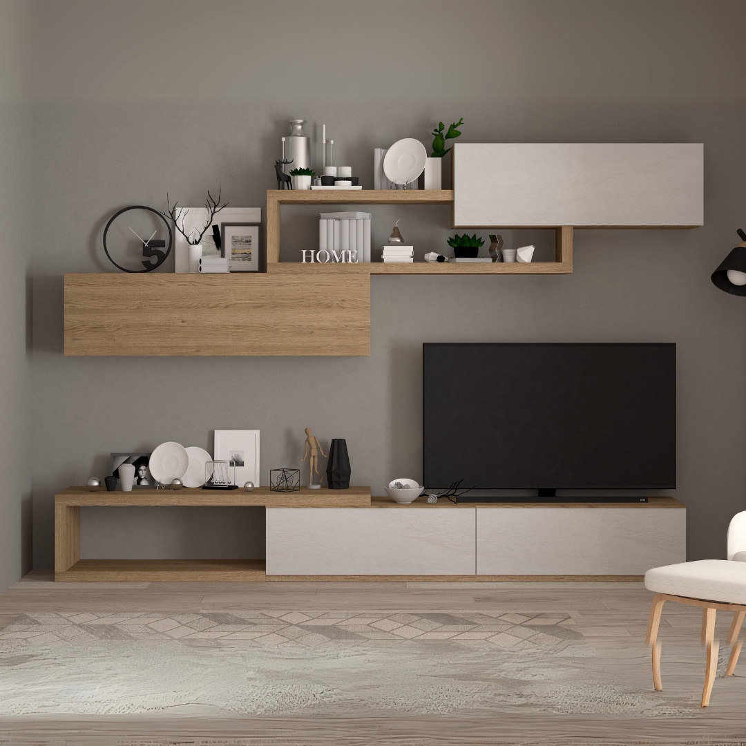 Il design della parete attrezzata Nordic regala carattere all’ambiente living. L’accostamento del rovere naturale e il colore calce la rendono perfetta per stili più moderni o naturali. Lo spazio non manca grazie alla vasta superficie di appoggio, ai vani richiudibili con ante a ribalta e ai numerosi vani a giorno sui quali riporre oggetti decorativi e di tendenza.