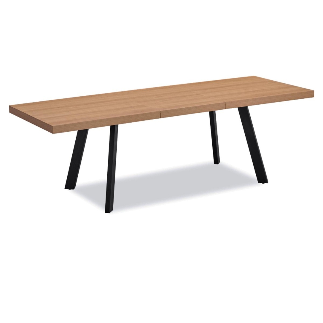 Tavolo allungabile con piano in MDF melaminico color rovere e gambe in metallo nere. Dimensioni: 180x240x90x76 cm.