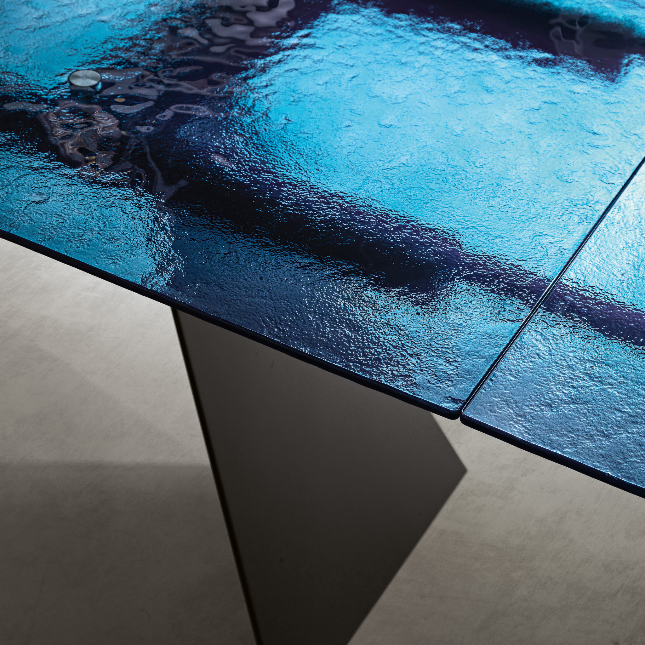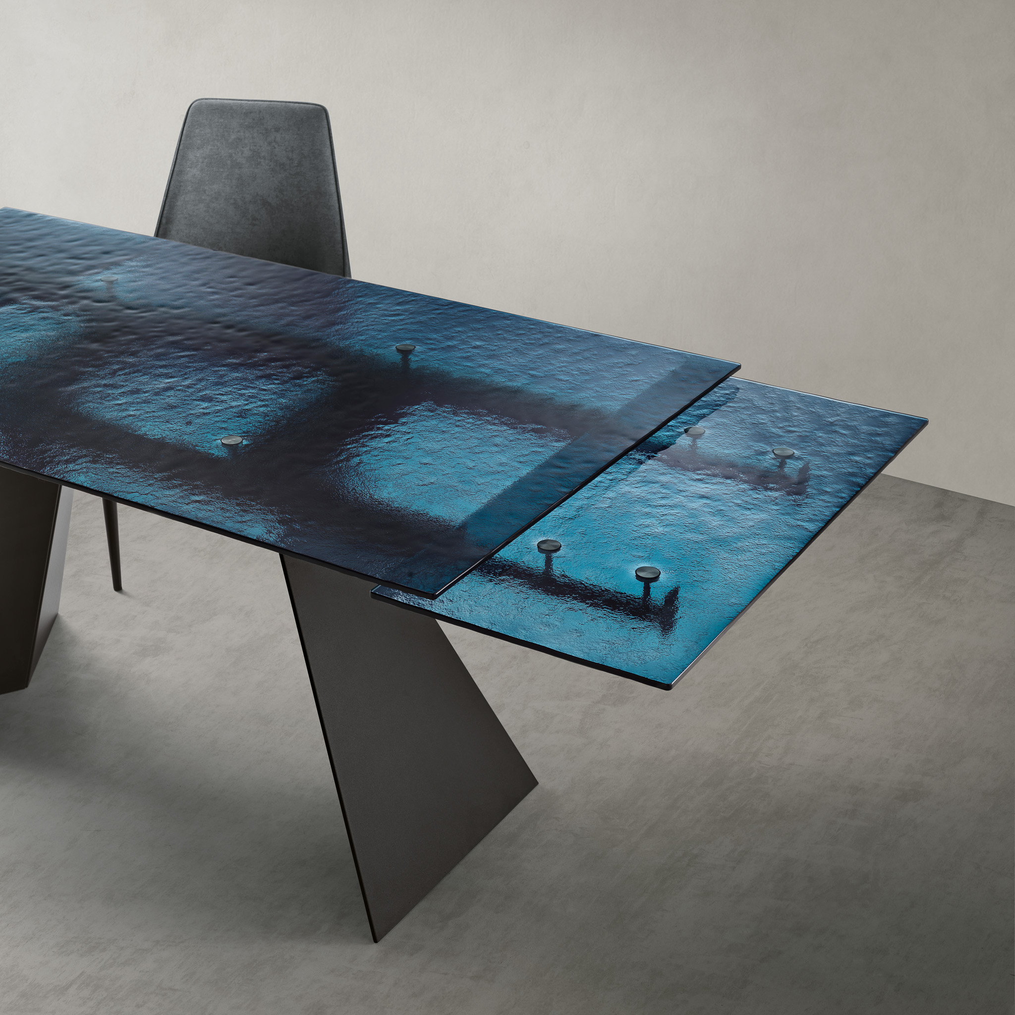 - Piano: Vetro martellato trasparente, che offre una superficie unica e sofisticata, aggiungendo un elemento di trasparenza e luminosità all’ambiente.