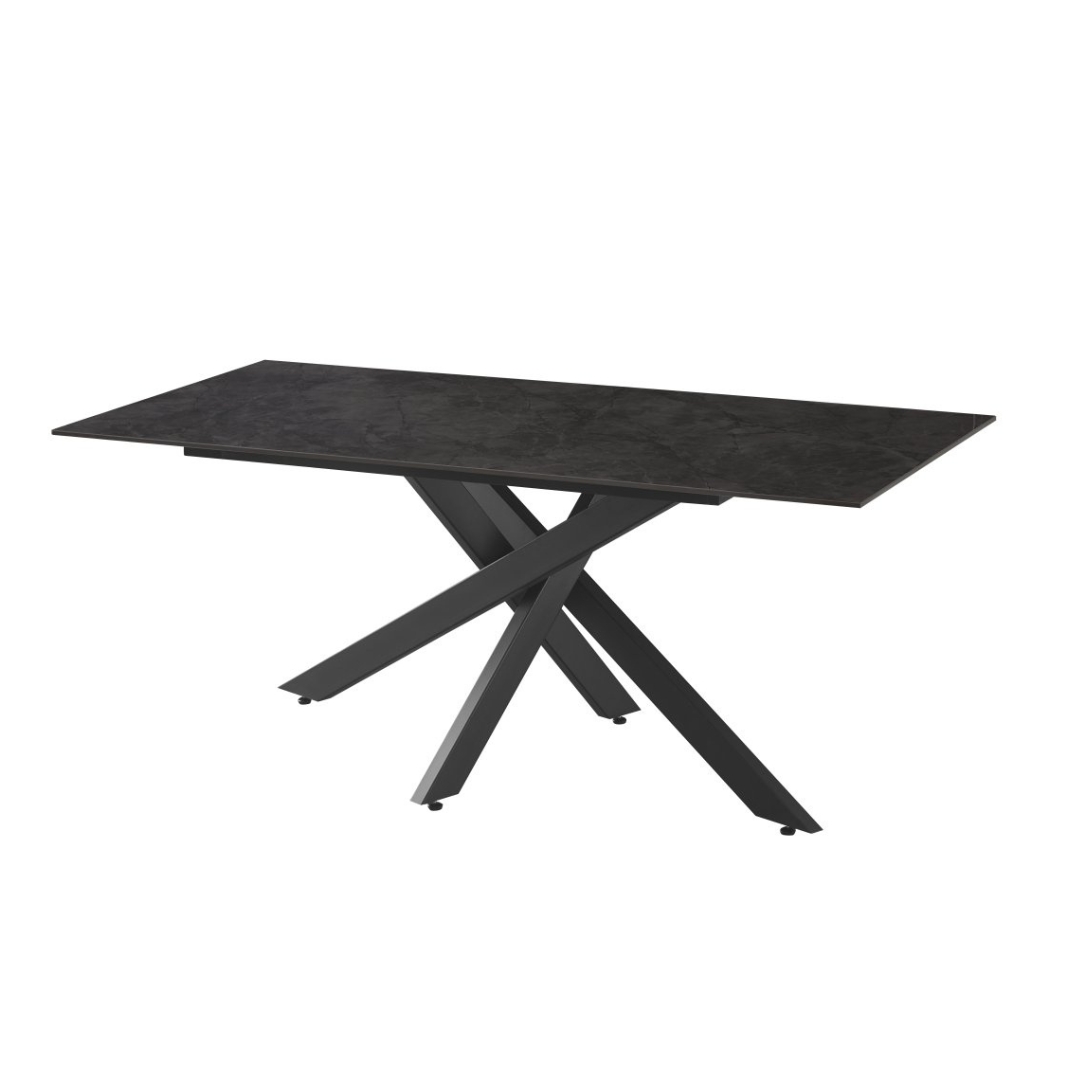 Tavolo rettangolare con top in ceramica effetto marmorizzato opaco e gambe in metallo verniciato a polvere, elementi che assicurano stabilità e sicurezza, il design moderno consente di collocarlo in qualsiasi ambiente e contesto.