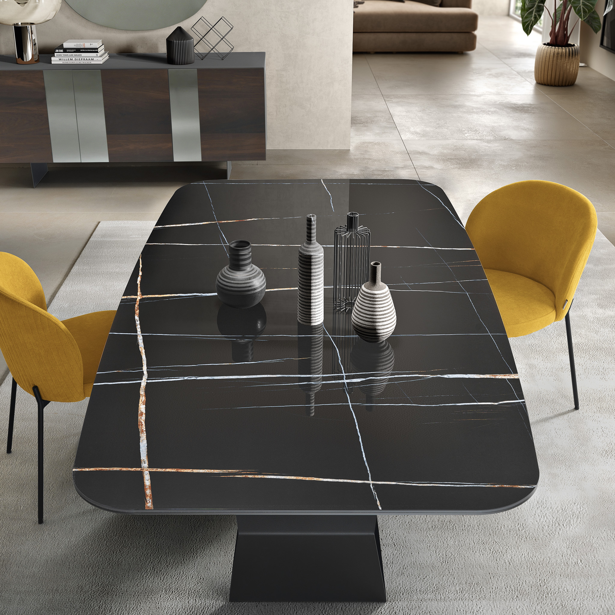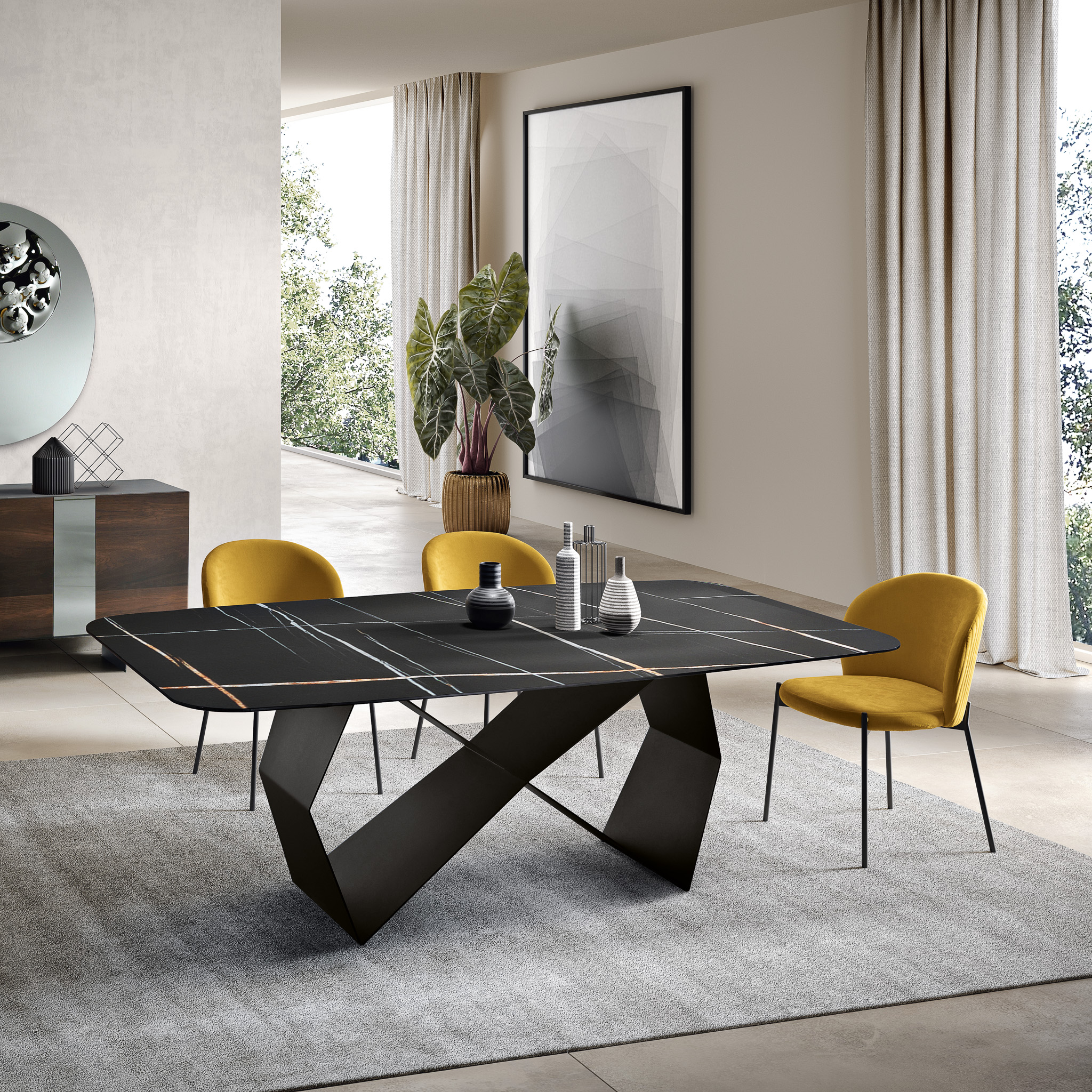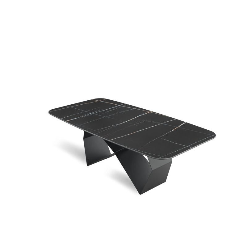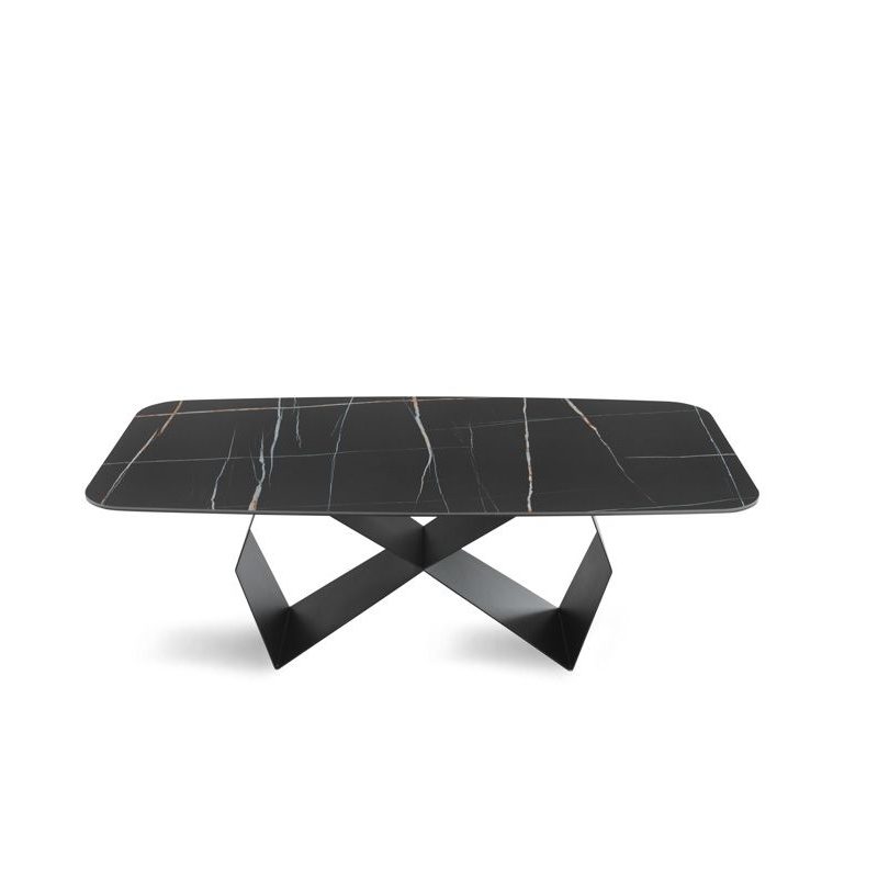 Tavolo Karl con base in metallo Nero verniciato e piano in ceramica effetto marmo stratificata su vetro – MARMO SAHARA NERO LUCIDO